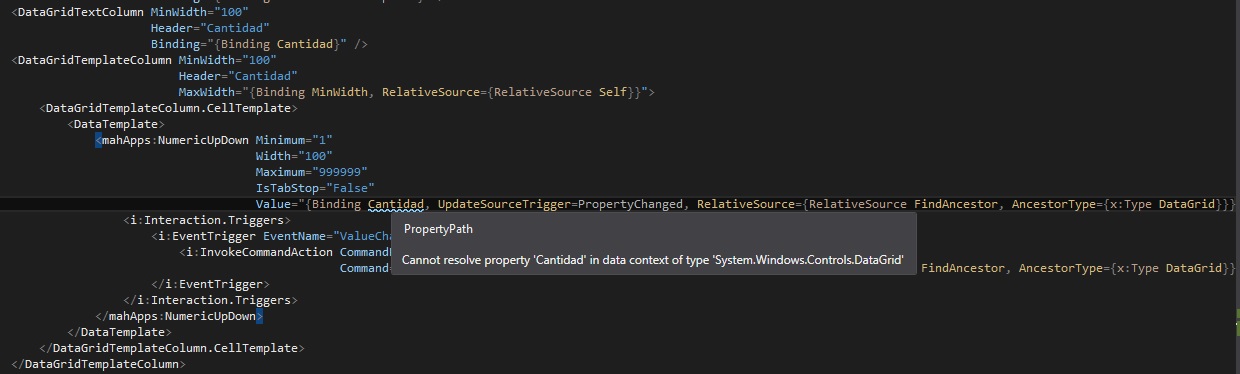 <mahApps:NumericUpDown Value="{Binding Amount, UpdateSourceTrigger=PropertyChanged, RelativeSource={RelativeSource FindAncestor, AncestorType={x:Type DataGrid}}}">
