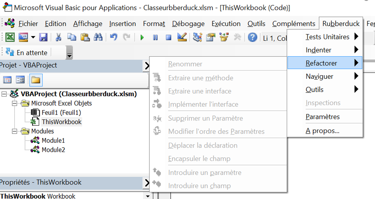 当我在Excel中打开一个启用宏的Excel工作簿并启动VBA编辑器时,Rubber鸭子会启动,但是Rubber鸭子菜单下的所有命令都会被禁用。