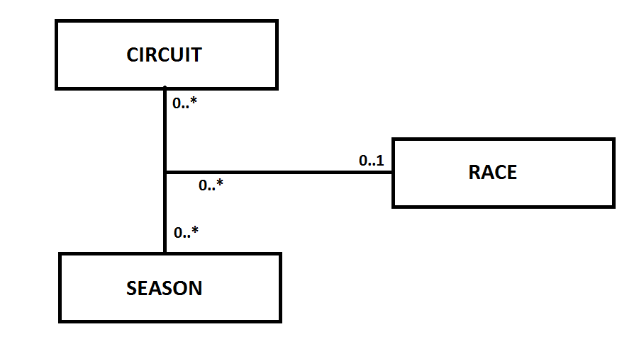 现在,每个赛季的赛道组合最多有一场比赛的限制从何而来?这是因为在一个关联端上有一个*(或任何数字> 1)意味着一个实例可能与多个不同的其他实例相关联,而不是与一个和另一个实例关联几次。