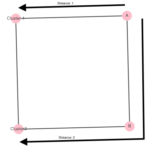 node A与节点Cluster 1.的距离为1边缘/链接。strong text**与节点strong text**的距离为2边缘/链接。对于这个图,我使用javascript + d3。
