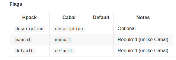 | Hpack | Cabal | Default | Notes |
