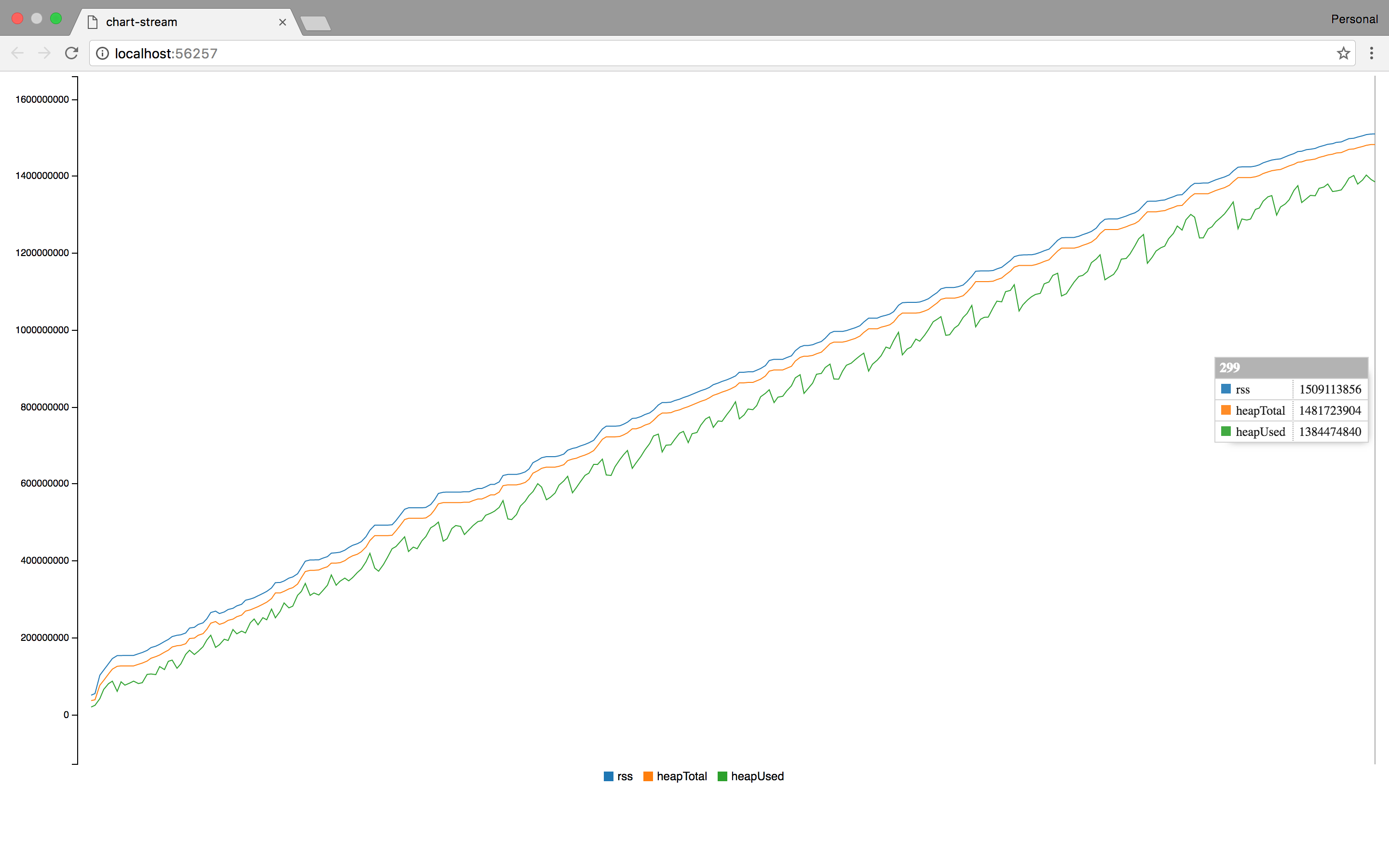 });下面是内存使用量的图表,它显示了这段代码在大约10分钟后占用了1.5GB的内存,并且1100个任务被解析,直到崩溃。