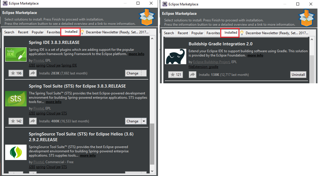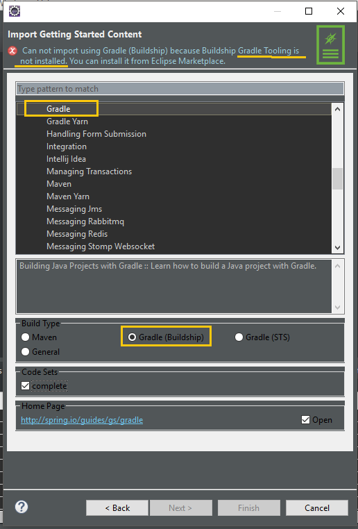 我试图通过Spring内容创建一个新的Gradle ( Buildship ),但是我一直收到错误:“无法使用Gradle (Buildship)导入,因为没有安装Buildship Gradle工具。您可以从Eclipse 安装它”。