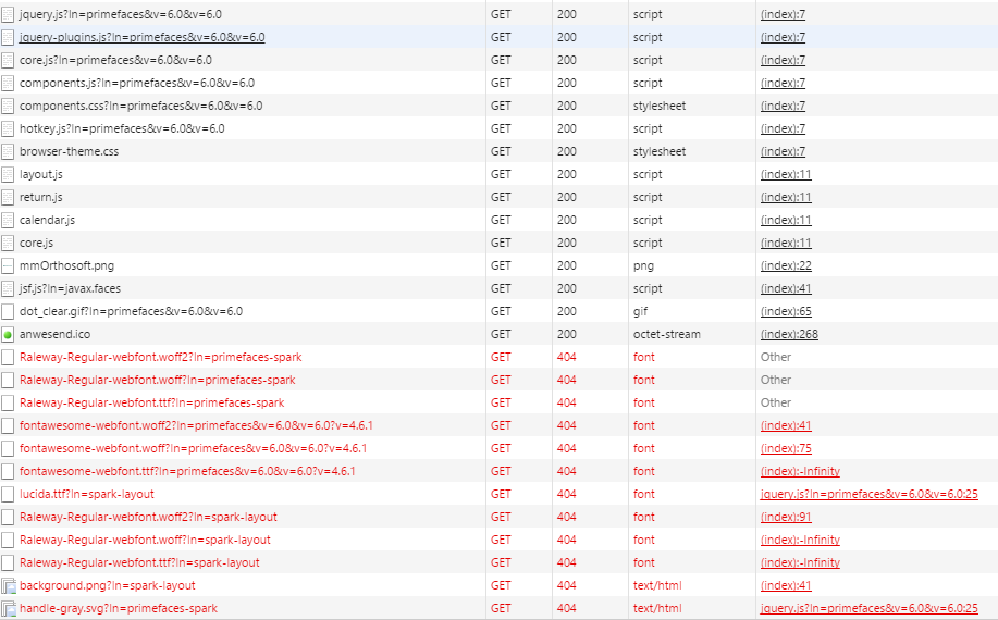 从Chrome工具中,我可以看到应用程序试图加载例如,在没有projectA-web-commons的情况下从../projectB/fonts/...加载字体资源,资源是从../projectB/javax.faces.resources/fonts...加载的