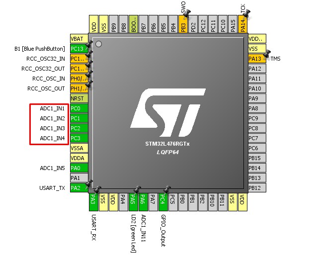 我可以用这个代码从ADC1_IN1通道读取ADC值,但是ADC1端口(你可以在图片上看到)有很多通道。如何从ADC1_IN2读取值?如何用代码描述第二频道?