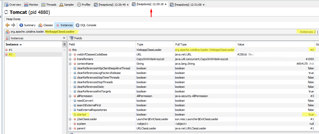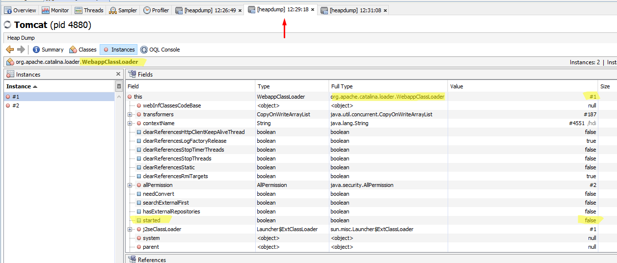 在下面的屏幕上,您可以看到有两个实例WebAppClassLoader。其中一个(编号#1)是旧的(它的属性"started“= false)。WCL #2是在重新部署应用程序之后创建的(它的属性"started“= true)。我们审查的线程有contextClassLoader =contextClassLoader为什么?我希望看到contextClassLoader = "java.net.URLClassLoader“(毕竟,当任何线程完成其工作时,它将返回到Tomcat的池中,其属性"contextClassLoader”被设置为任何基类加载程序)。