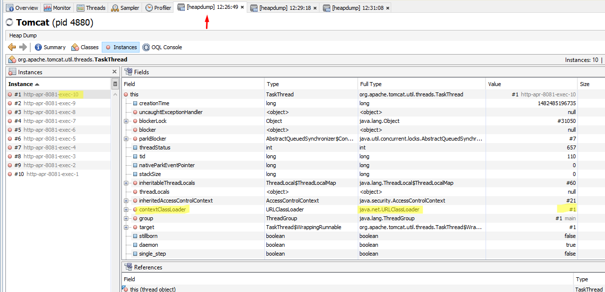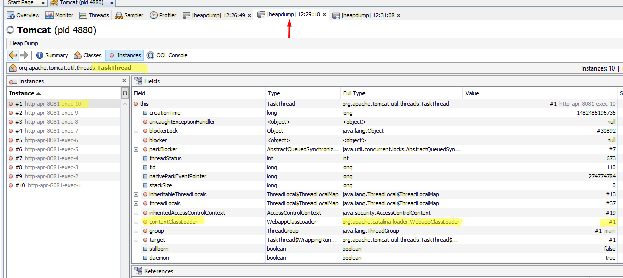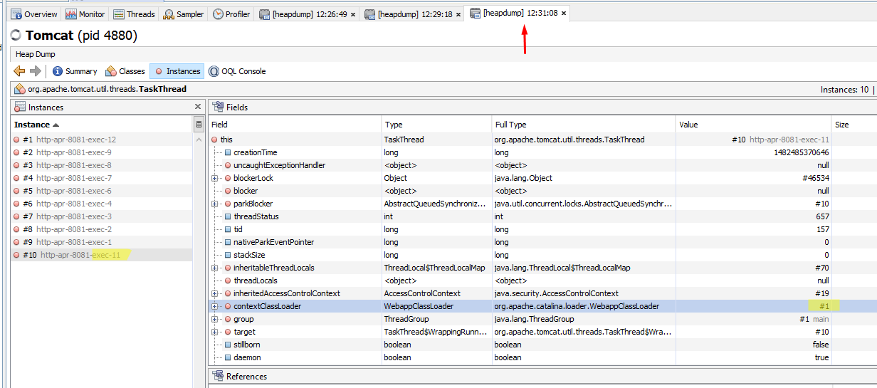 在下面的屏幕上,您可以看到,在我单击“重新部署”之后,除了线程"http-apr-8081-exec-10“之外,所有线程(与此web应用程序相关联)都被杀死。当我设置Tomcat的属性"renewThreadsWhenStoppingContext == true“时,您可以看到,经过一段时间之后,这个线程(”http 8081-exec-10“)被杀死,新线程(http 8081-exec-11)被创建。因此,我没想到在创建堆转储3之后会有旧的WCL,因为没有任何旧的线程或对象。