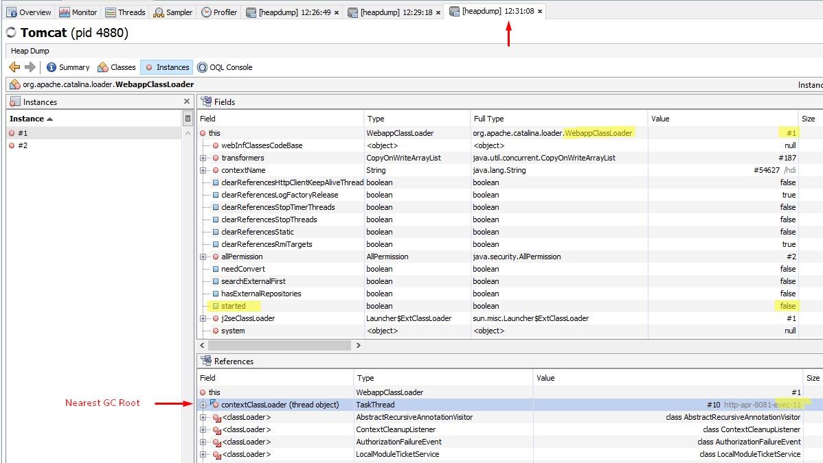 最后,我们有以下内容:有线程"http-apr-8081-exec- 11“,它具有指向WebappClassLoader #1的引用。而且,显然,当我在WCL #1上创建”最近的GC根“时,我将看到线程11的引用。