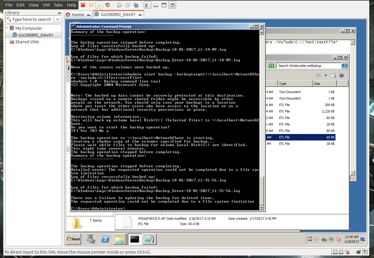 wbadmin start backup -backuptarget:\\(IP address of network)\Public -inlcude:C:\!Test\testFile*这是日志报告: