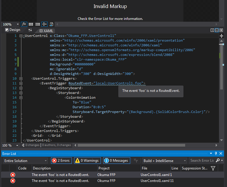 我尝试在现有项目的用户控件中创建一个路由事件,并得到错误消息The event 'foo' is not a RoutedEvent.