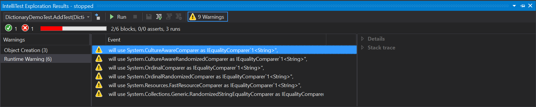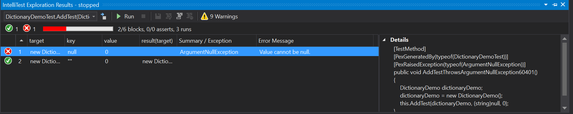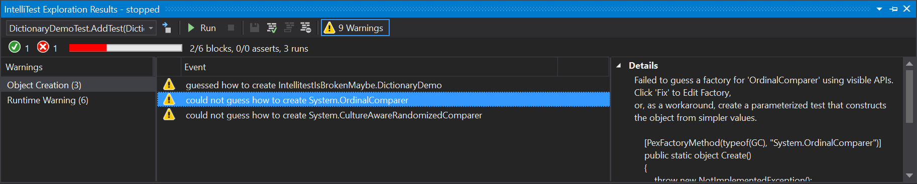 我担心的是这些警告。我不明白Intellitest为什么要尝试创建这些类型的实例。我最初假设Intellitest试图设置dictionary字段,并使用这些实例实例化一个新的Dictionary。这是不理想的行为,所以我添加了[PexExplorableFromConstructor(typeof(DictionaryDemo))]属性,它应该(我相信)阻止任何私有字段的直接设置,但是除了猜测如何创建DictionaryDemo消失的警告之外,结果是相同的。