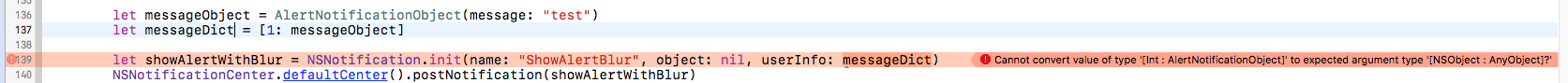 let showAlertWithBlur = NSNotification.init(name: "ShowAlertBlur", object: nil, userInfo: messageDict)