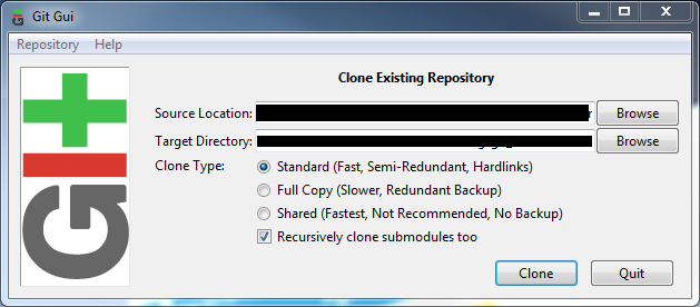 使用标准的git-gui (v0.20.GITGUI),当您想要克隆一个存储库时,有三个“克隆类型”选项: