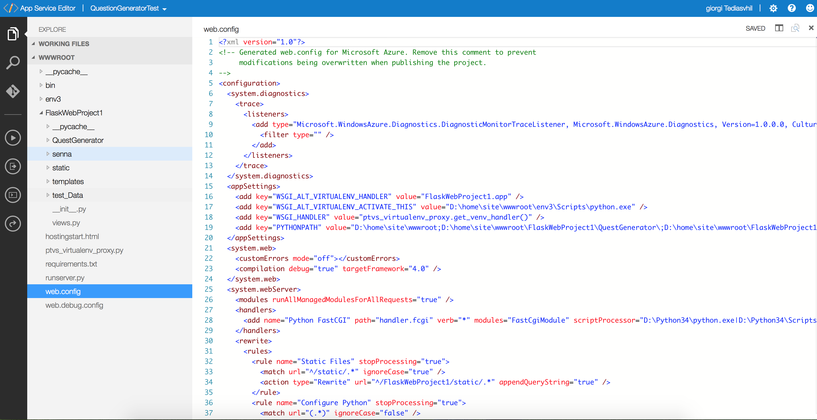 但是,我认为您的问题可能是由于代码中的senna_path不是Azure WebApp上的有效路径造成的。我尝试创建一个简单的Python脚本,如下所示在Azure WebApp上使用Kudu控制台测试您的代码,它通过命令python test.py > test.out.txt工作得很好。