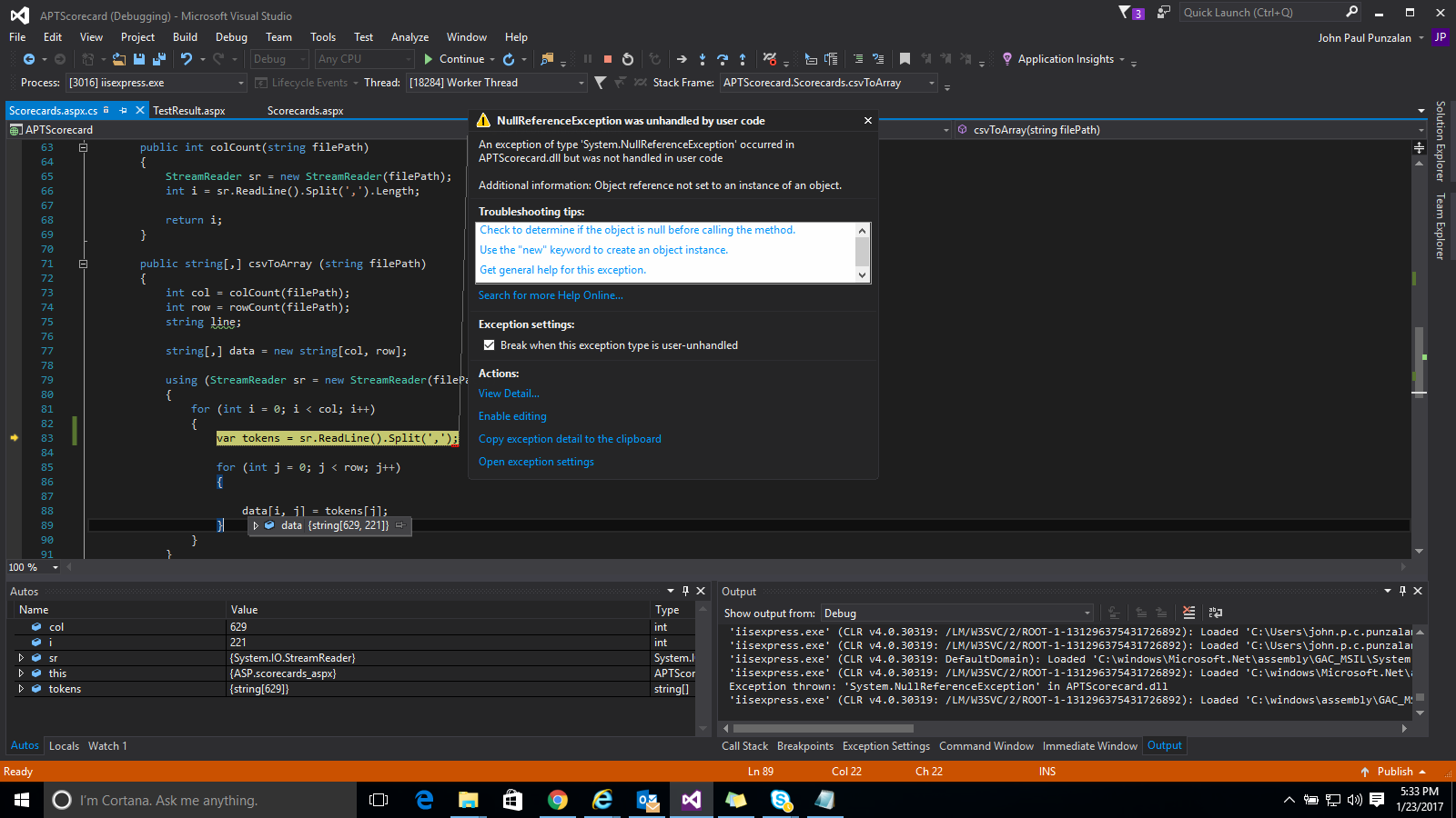 }在您的代码中,您正在执行null.Split(),这就是它给您异常的原因。