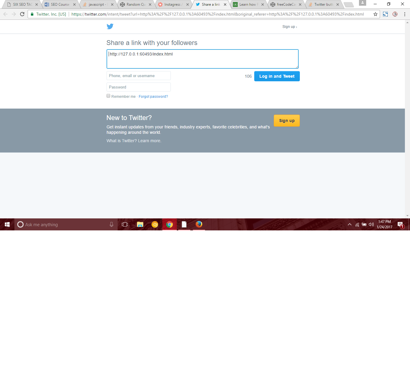 你不会想要那样的。该链接没有数据被传递,因此twitter是默认的URL作为twitter.com/intent/tweet?url=&original_referer=,它生成文本作为您来自的URL。(就你而言,这是你的本地人)。