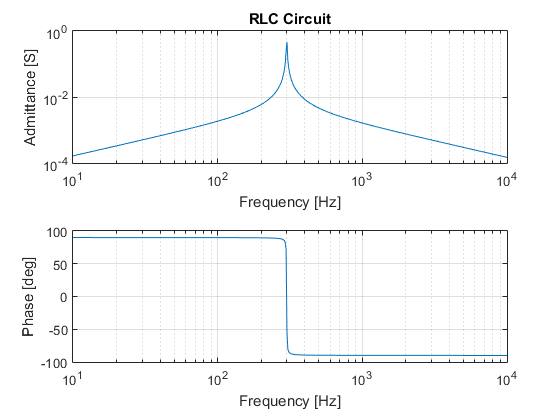 最后,我创建了以下脚本(受这个例子的启发),该脚本利用power_analyze函数获得电路的状态空间模型 (my_rlc),从而获得导纳。由于RLC电路的特性随频率的变化而变化,我利用bode函数得到了10 Hz到10 kHz频率范围内导纳的大小和相位。