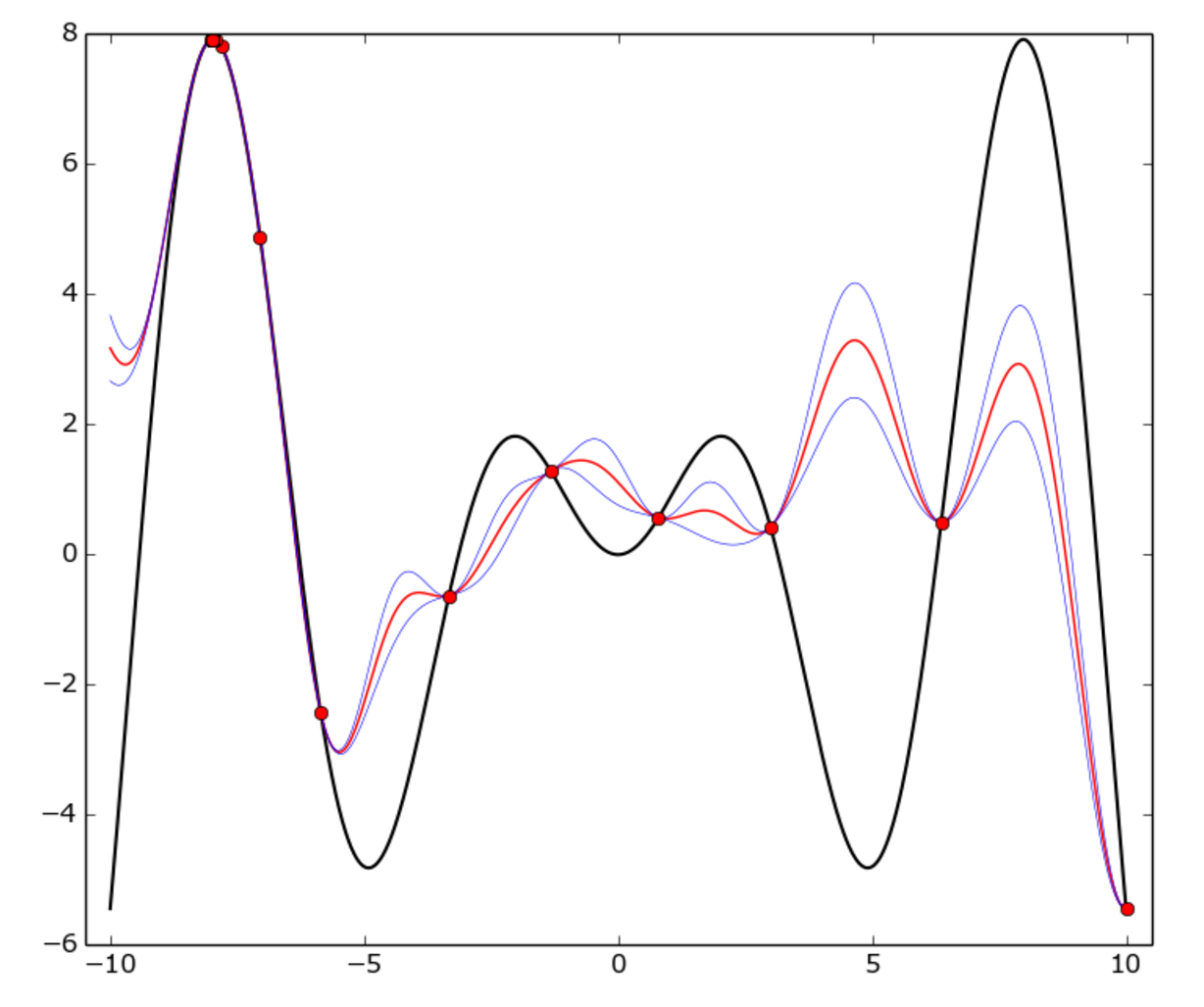 真正的函数是f(x) = x * sin(x) (黑色曲线)在[-10, 10]区间。红点代表每个试验,红色曲线是GP平均值,蓝色曲线是平均正负一个标准差。正如您所看到的,GP模型并不是所有地方都匹配真正的函数,但是优化器很快就确定了-8周围的“热点”区域,并开始利用它。