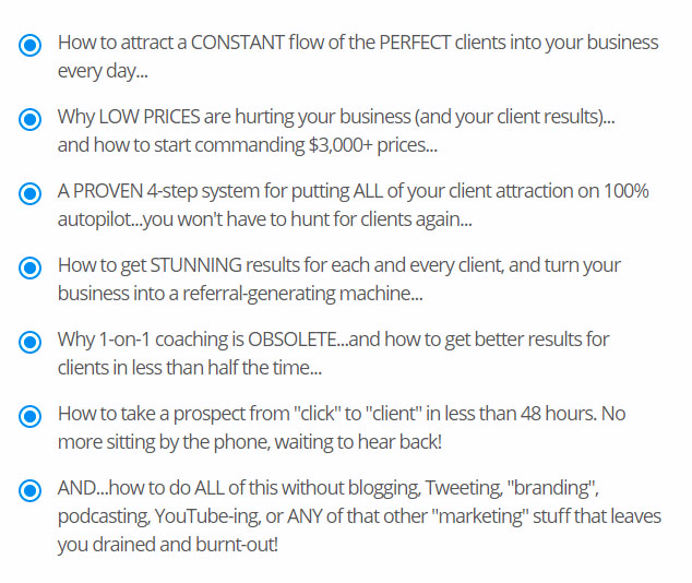 <li style="margin: 16px;">A PROVEN 4-step system for putting ALL of your client attraction on 100% autopilot...you won't have to hunt for clients again...</li>