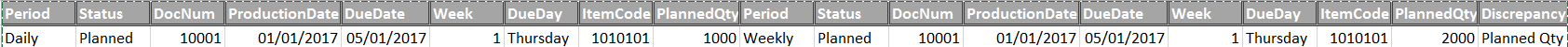 WeeklyProduction) w ON w.[DocNum] = d.[DocNum]它返回的内容如下: