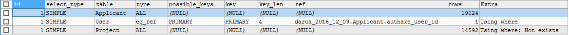 SELECT `Applicant`.`id`, `Applicant`.`name`, `User`.`login`, `User`.`id`, Project.id