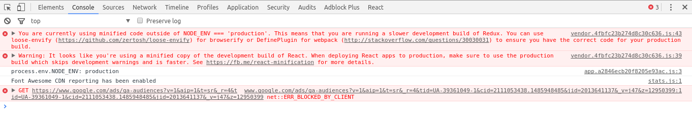 Warning: It looks like you're using a minified copy of the development build of React. When deploying React apps to production, make sure to use the production build which skips development warnings and is faster. See https://facebook.github.io/react/docs/optimizing-performance.html#use-the-production-build for more details.