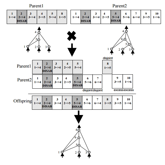 关于第二个数字,这只是一个例子,以显示如何交叉工作时,有不相交的INs。为了这个例子,父母就是这样的。然而,他们本可以很容易地达到这种状态。想象一下,父母1,在进化的早期,只有INs 1到5,而5是目前为止最新的。然后,在群体中的其他地方,在神经元5和4之间添加一个新的神经元(6号),即新连接5->6和6->4。由于还没有遇到这样的连接,所以IN计数器被增加到6和7。然后,通过添加新连接1->8而使父1发生突变。由于这也是新的,所以分配了新的IN 8。
