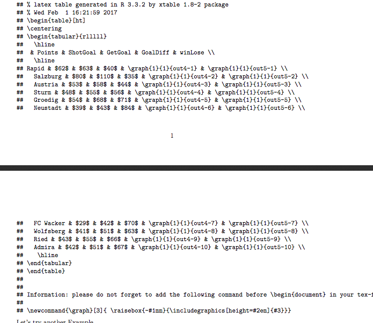 results = 'asis'添加到代码块,infonote of export()设置为FALSE。最后一点可以防止LaTeX编译器抛出的另一个错误(即我们已经定义了命令\graph)。