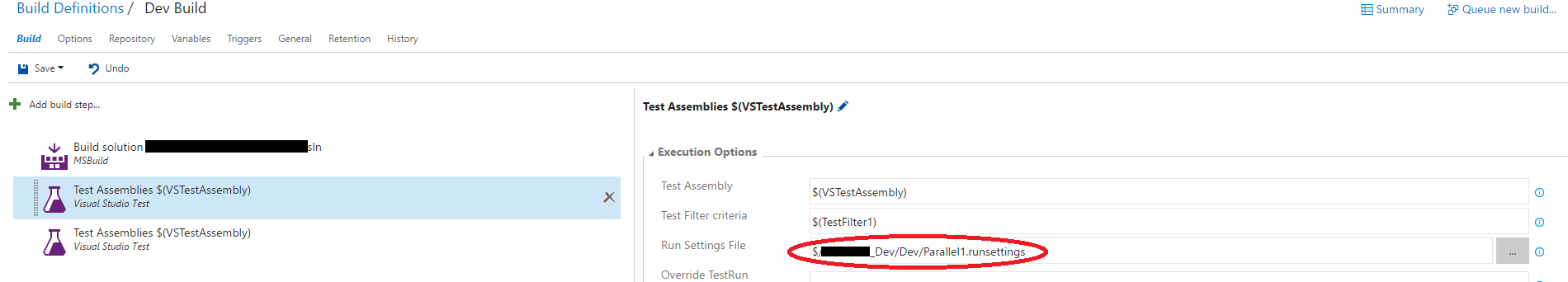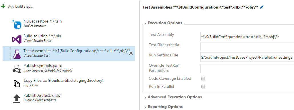 2017-02-03T06:08:37.8352139Z Executing C:\Program Files (x86)\Microsoft Visual Studio 14.0\Common7\IDE\CommonExtensions\Microsoft\TestWindow\vstest.console.exe "C:\Agent\_work\10\s\ClassLibrary1\bin\Release\Microsoft.TeamFoundation.TestManagement.Client.dll" "C:\Agent\_work\10\s\TestCaseProject\bin\Release\Microsoft.TeamFoundation.Test.WebApi.dll" "C:\Agent\_work\10\s\TestCaseProject\bin\Release\Microsoft.TeamFoundation.TestManagement.Client.dll" "C:\Agent\_work\10\s\TestCaseProject\bin\Release\Microsoft.TeamFoundation.TestManagement.WebApi.dll" "C:\Agent\_work\10\s\UnitTestProject1\bin\Release\Microsoft.TeamFoundation.TestManagement.Client.dll" "C:\Agent\_work\10\s\UnitTestProject1\bin\Release\UnitTestProject1.dll" /Settings:"C:\Agent\_work\10\s\Parallel.runsettings" /logger:trx请检查是否在构建定义的Repository选项卡中映射了运行设置文件。并尝试清除构建代理上的缓存文件:C:\Users\username\AppData\Local\Microsoft\Team Foundation\7.0\Cache。