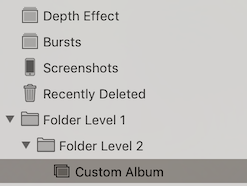 使用当前的developer (PhotoKit),没有一种简单的方法(比如一个请求)来列出文件夹(及其子文件夹/相册)中的所有资产。但是,您可以递归地枚举文件夹中的所有相册及其子文件夹,然后将结果放入一个数组中。但是,根据嵌套结构中包含的级别和资产的数量,这可能是缓慢的。请注意,任何级别上的文件夹也可以包含相册(例如,在“文件夹级别1”中,除了“文件夹级别2”外,还可以有一张相册)。苹果的Photos并没有使用PhotoKit,所以我想他们有办法用一个请求来完成这个任务。