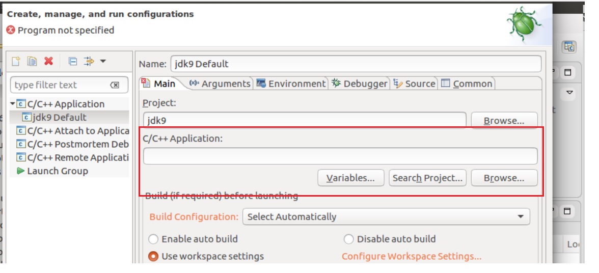 然后我尝试配置"Debug配置“,但是我不知道如何设置c/c++应用程序,有人建议它用于JDK 7,但是我在jdk 9的构建输出文件夹中找不到它,我尝试将它设置为"~/jdk9/build/linux-x86_64-normal-server-fastdebug/jdk/java”,然后单击“”~/jdk9/build/linux-x86_64-normal-server-fastdebug/jdk/java“”按钮来调试它,但是它失败了,信息是“main没有可用的源代码”。那么,我的问题是1 )如何做设置,让我成功地调试jdk源代码? 2 ),如果还有其他地方我需要设置?