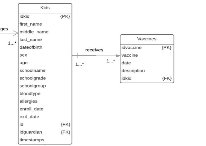 这意味着,在kids_vaccines表中,您将把idkid和idvacccine管理为两个外键(当然,您的时间戳在这里,以便知道何时将疫苗应用于儿童)。