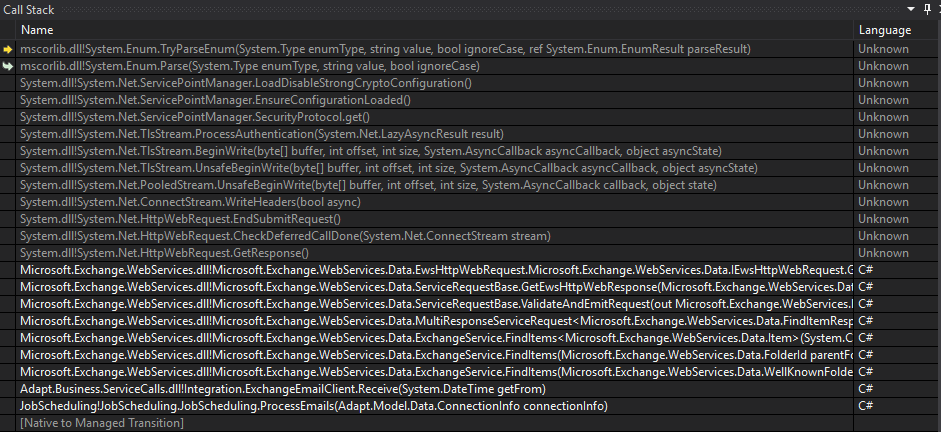 它说它是一个ArgumentNullException,但是一个参数是枚举,而另一个参数在运行时不是空的。从堆栈上看,这似乎是EWS中的一个例外,它没有很好地处理,但我不知道问题是什么。