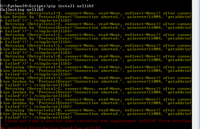 我使用的是命令pip install urllib3,我得到的错误跟踪如下所示。