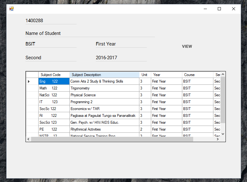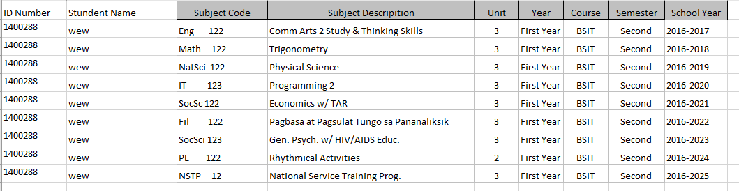 在“学生负载”中,我有ID号、StudentName、SubjectCode、SubjectDescription、Unit、年份、课程、学期和SchoolYear。