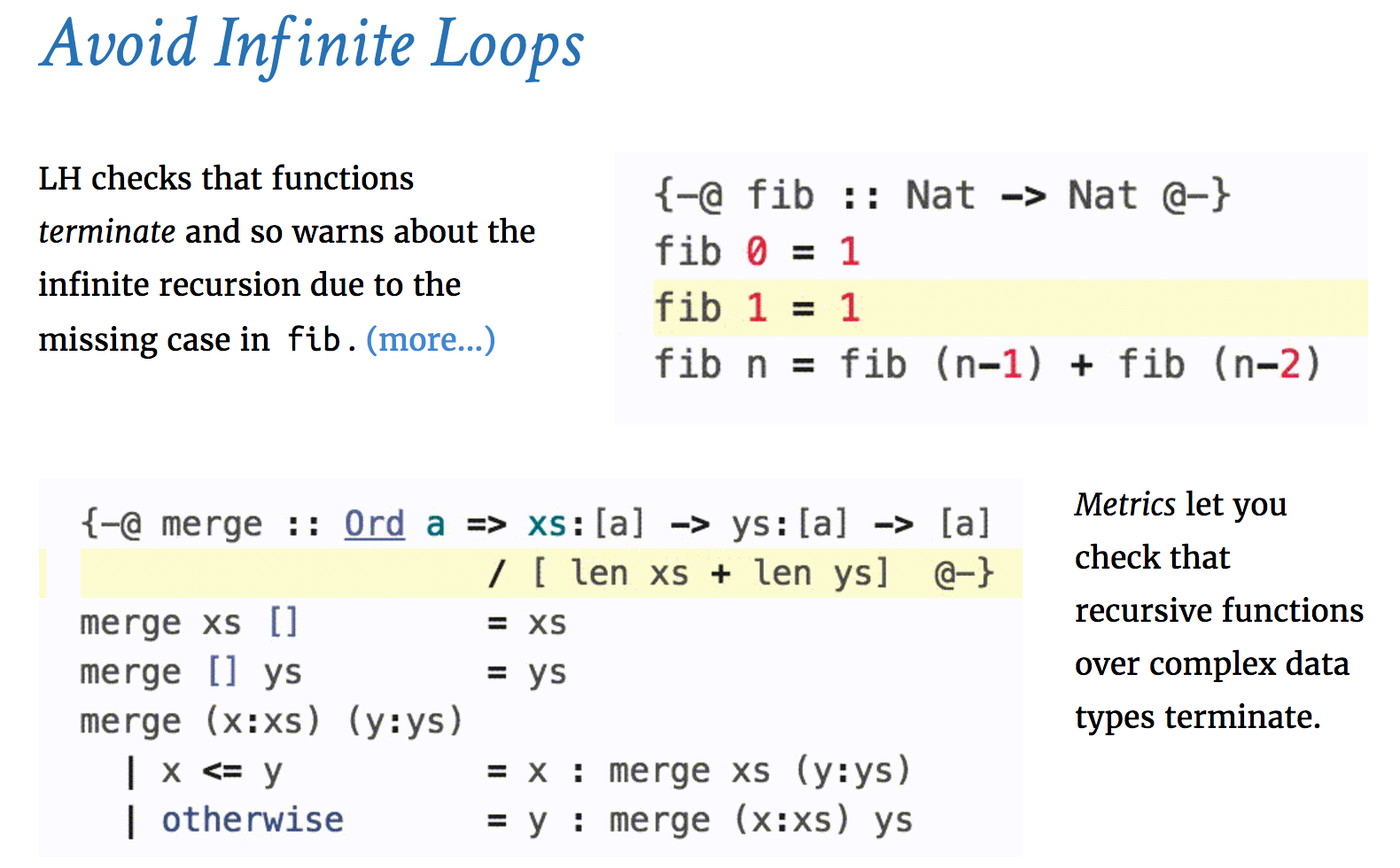 类似于Agda或其他具有总体检查的语言,函数的参数必须在结构上随着时间的推移变得更小,才能到达基本情况。与总体检查器相结合,可以对许多功能进行可靠的检查。LH还支持通过指示事物如何减少来帮助检查器,这可以使用不透明的抽象数据类型或FFI。这真的很实用。