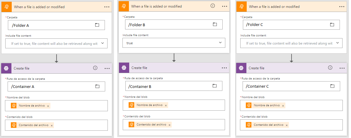 我使用Microsoft Flow存储FTP中的文件。我有来自FTP的三个不同文件夹的流,每个文件夹都存储在不同的容器中。