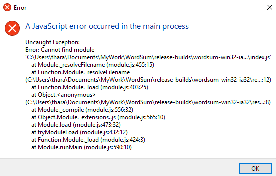 我已经创建了一个示例电子应用程序,我需要从它创建一个.exe文件。我成功地构建了这个没有错误的应用程序,但是当我启动应用程序时出现了一个错误,我不知道为什么要让this.How来解决这个问题?