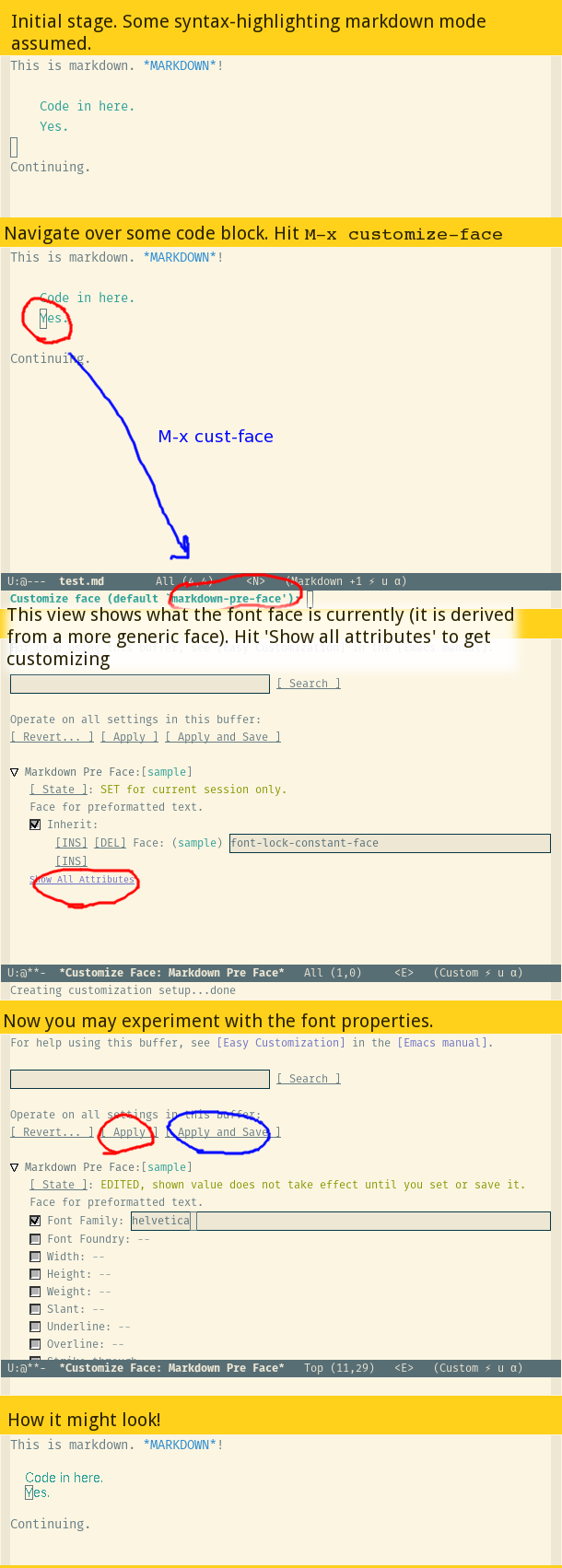 我准备了一些截图来显示工作流。确定emacs允许的字体家族或铸造是一种黑暗的魔力,我把它留给谷歌去寻找更多的信息。在linux系统上,曾经有一个名为xfontsel的丑陋的小助手,您可以在这里预览不同的字体系列和铸造厂。