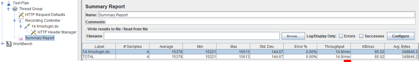当我在JMeter中执行测试的次数少于10 Thread Groups时,在Summary Report列Throughput中显示Minutes的结果。