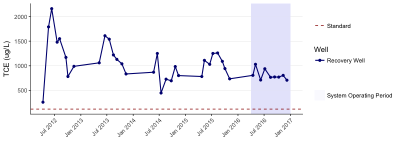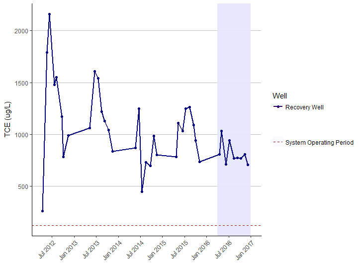 随着时间的推移,我正在绘制TCE浓度的线状图。该图形有一个阴影区域(我用geom_rect创建)和一条虚线(用geom_hline创建)。我想要一个图例来解释阴影区域和虚线意味着什么,除了解释线图中的线意味着什么。我想出了如何用阴影区域来做这件事,并给它贴上了“系统运行周期”的标签。然而,我不知道如何为虚线这样做。当我在show_guide函数中设置geom_hline = FALSE时,我可以在图例中创建一条水平线,但是阴影区域和水平虚线在图例中重叠(即虚线红色线位于薰衣草阴影框的顶部)。如何使虚线图例和阴影区域图例不重叠?提前感谢!
