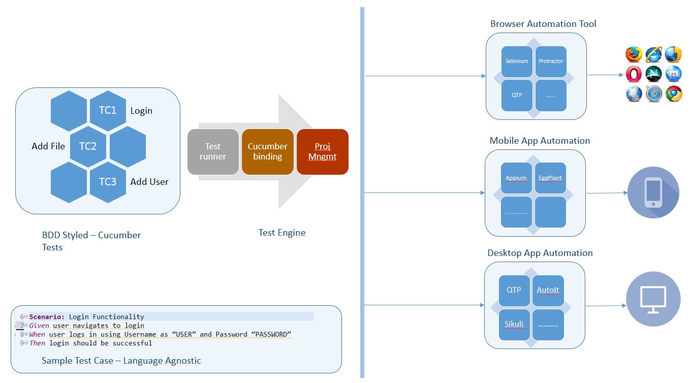 Cucumber框架可以针对任何应用程序运行测试:移动应用程序、移动web或桌面应用程序,而不管这些应用程序是用哪种语言编写的(我们使用ruby/黄瓜和各种插件对这三个应用程序进行测试)。