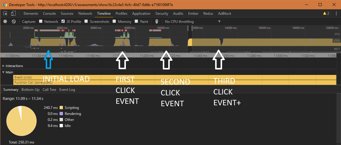 这是我遇到的问题的时间线表示。几乎就好像点击事件正在以指数级的速度增长?