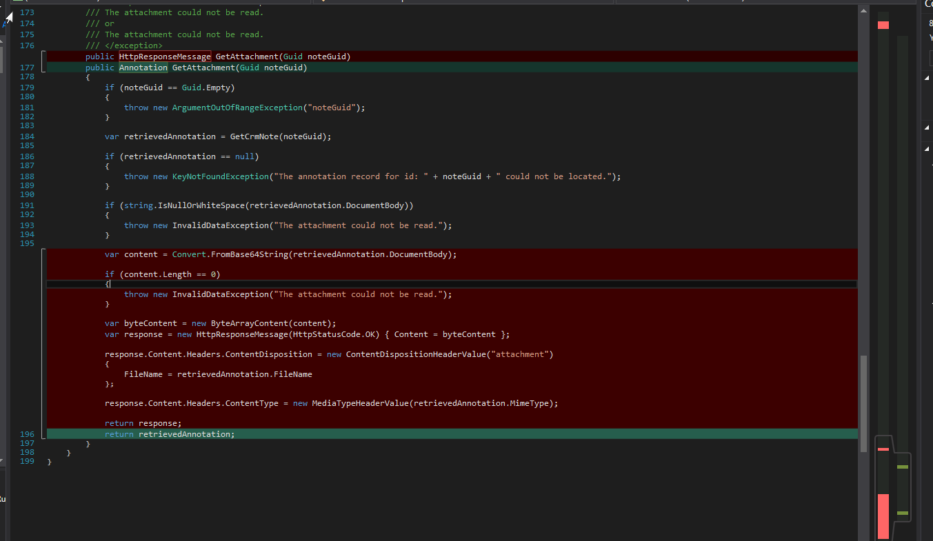 我无法并排比较文件,相反,visual studio只是将它们叠加到同一个文档上,并用绿色/红色高亮显示: