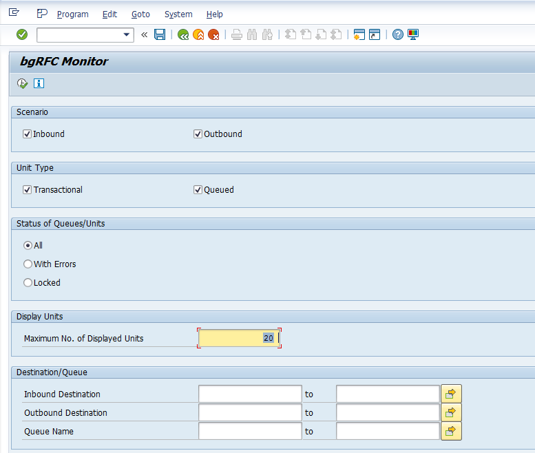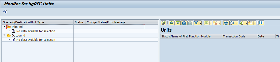 我认为“sbgrfcmon”是一个Monitor,您将只看到处于错误状态或排队等待处理的条目。如果您没有或只有有限的活动没有任何错误,您将是幸运的,在这里看到任何条目。请参阅bgRFC监视器