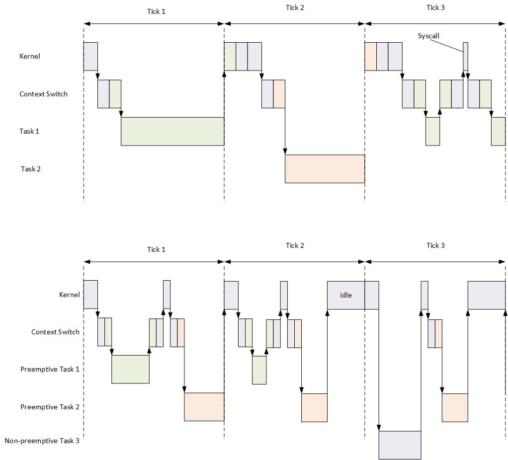 第二个图表显示了一个子刻度内核调度器,其中多个任务可能共享相同的刻度中断。使用最大执行时间值调用了Task1,因此它需要两个滴答才能完成。Task 2设置为低优先级,因此在完成时会消耗每个滴答的剩余时间。Task3具有非抢占性,因此它在内核空间上运行,节省了一些宝贵的上下文切换时间。
