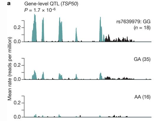 每个基因型的RNA seq覆盖率(资料来源: pickrell等人,自然,2010年)