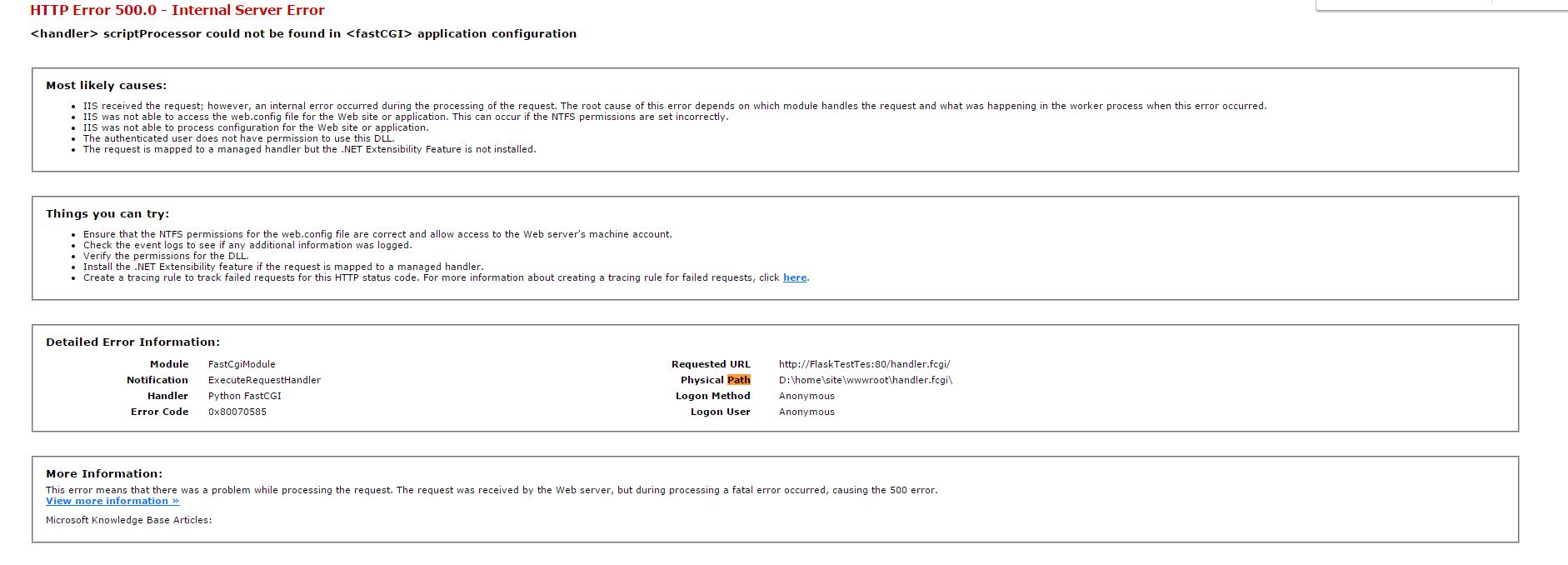 我正在尝试在Azure web应用程序中部署Python应用程序。我创建了web应用程序(Flask)并发布了我的代码。发布后,我从网站得到以下错误。