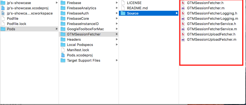 还有一些其他的事情,但这些都是主要的,但什么也没有起作用。我想这真的是因为GTMSessionFetcher.framework没有被发现?我搜索了我的项目的Pods目录,找到了GTMSSessionFetcher > Source >,并在下面的图片中找到了这些文件。