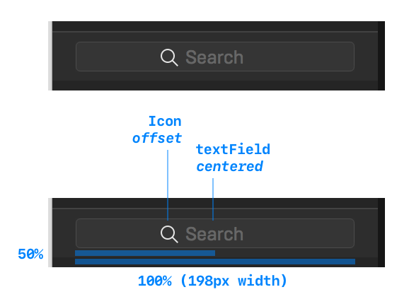 我使用的是NSSearchField (不是子类)。当焦点不集中时,placeholderString就会以中心为中心。但是左边的lupe图标出现了一点偏移,所以实际上整个事情似乎没有居中。